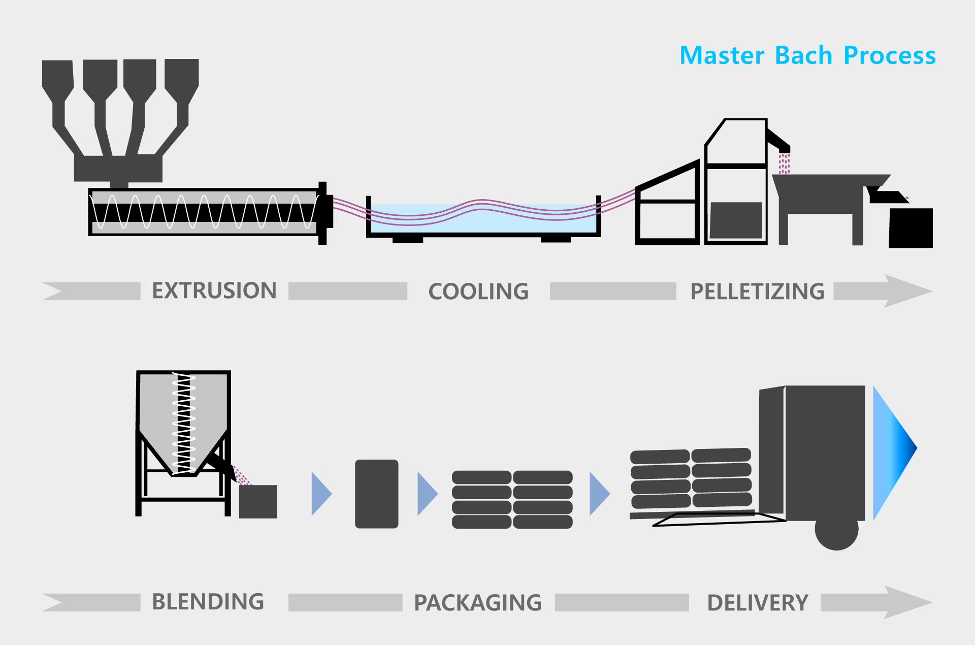 플라스틱 원료에 혼입하여각 첨가제의 계량을 정확하게 할 수 있고 플라스틱의 성형가공 시, 안료의 분산을 좋게 하는 데 사용되는 팰릿을 만드는 플라스틱 가공법을 의미합니다.